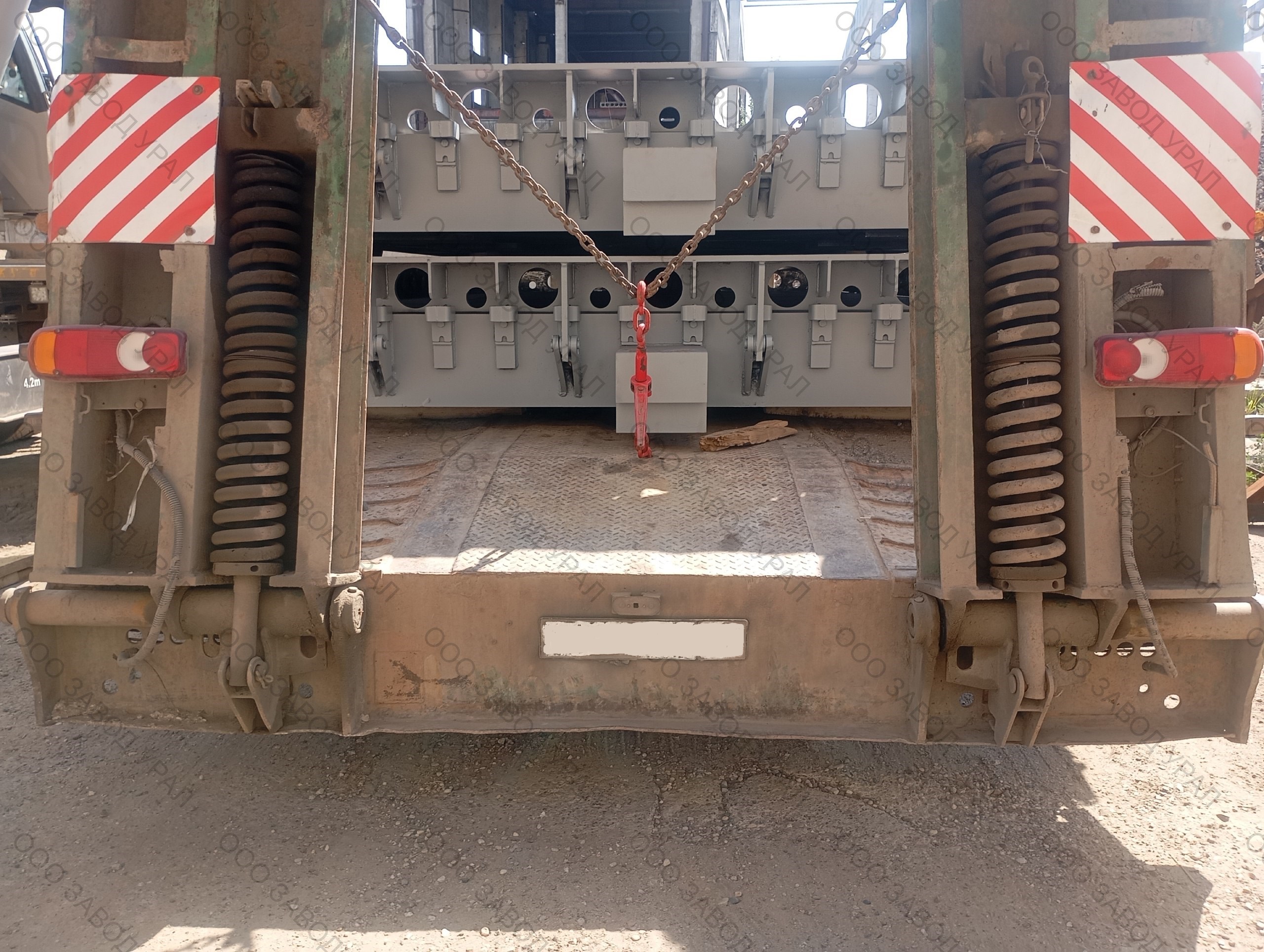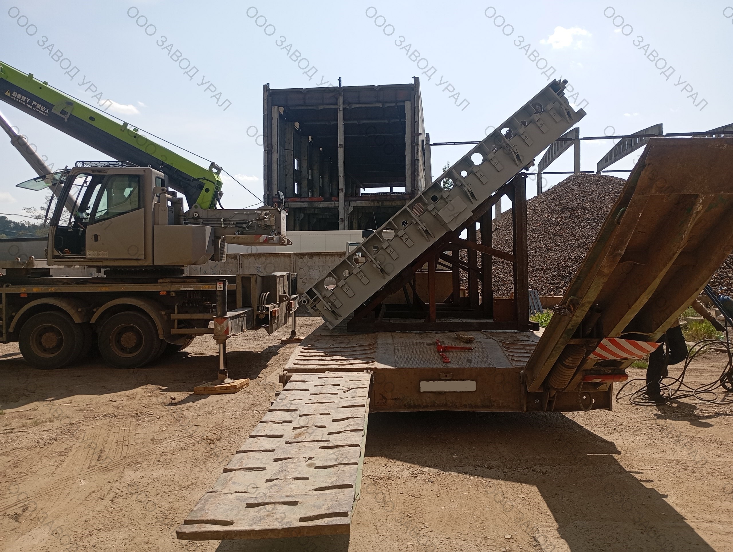 Металлоформы для производства плит перекрытия изготовлены по проекту заказчика. Ввиду того, что форма спроектирована сразу на два изделия, её ширина превысила допустимые габариты по выгрузке. Была спроектирована рама для вывоза формы под наклоном с последующим размещением на трале с помощью крана большой грузоподъемности.